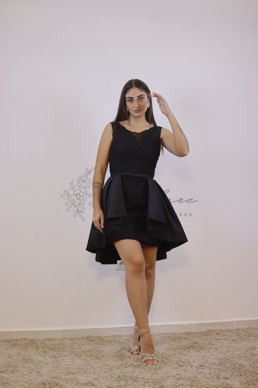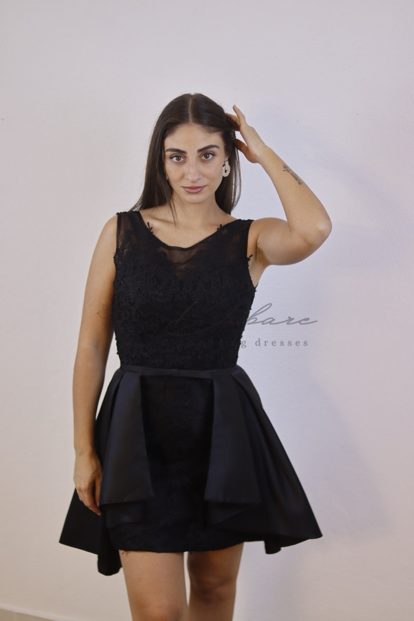 Este deslumbrante vestido curto é a personificação da elegância moderna, perfeito para festas ou eventos semiformais. Confeccionado em um tom preto clássico e atemporal, existem também em outras cores em vermelho, cinzento e na cor bordeaux, o modelo apresenta um corpete justo e acinturado, com decote discreto e detalhe sutil de renda na parte superior. A verdadeira peça de destaque é a saia envase, estruturada e volumosa, que confere um toque dramático e festivo. A saia é habilmente trabalhada com camadas e pregas em tafetá acetinado, criando um efeito de balão chique e mantendo a forma impecável. O comprimento acima do joelho alonga a silhueta, enquanto a cintura é marcada, valorizando a figura.