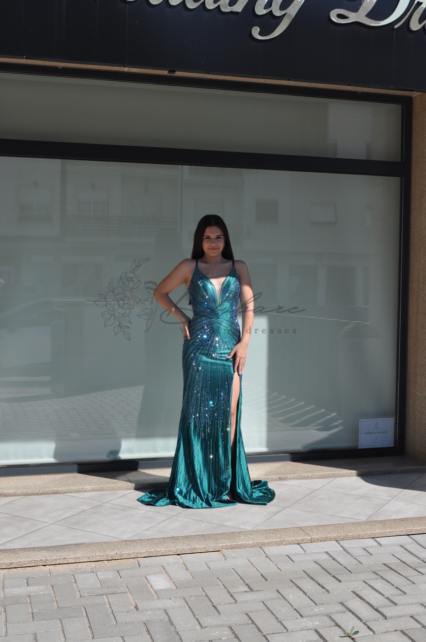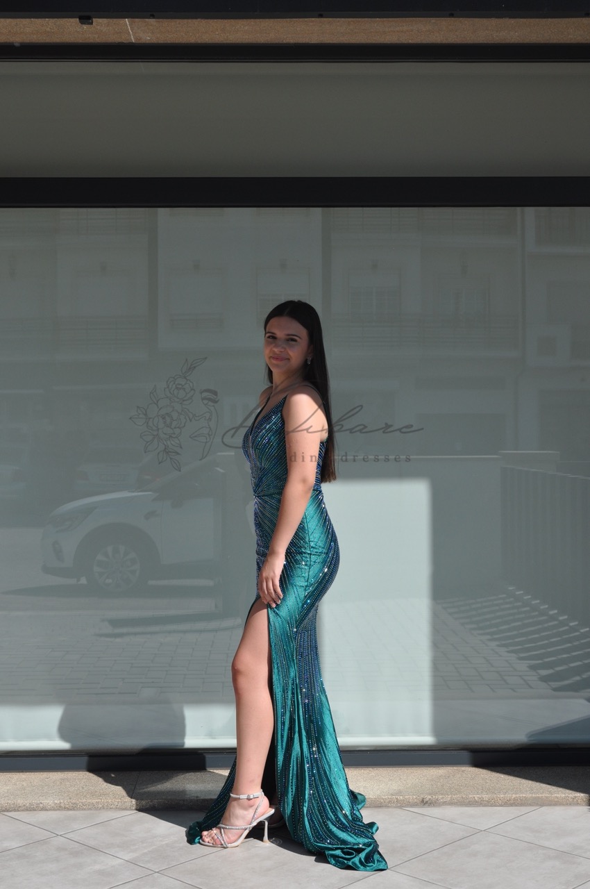 Entre no centro das atenções com o nosso Vestido de Gala Sereia “Verde Cintilante”, uma peça verdadeiramente cativante, desenhada para quem deseja brilhar com sofisticação. Este vestido é confeccionado num luxuoso tom verde esmeralda profundo, um toque de cor real que evoca elegância e drama. O tecido, que parece ser um cetim ou um material similar com um belo caimento, é ricamente adornado com aplicações de brilho ou strass em toda a sua extensão, criando um efeito cintilante que capta a luz de todos os ângulos. Estas aplicações estão dispostas de forma a alongar a silhueta, conferindo um glamour de passadeira vermelha. Com um decote em V e alças finas, o corpete oferece um ajuste moderno e de suporte. O corte é um clássico estilo sereia (ou justo ao corpo), abraçando a figura da cintura até às ancas e abrindo suavemente no final. Um pormenor de fenda na perna adiciona uma dose de sensualidade e facilita o movimento, equilibrando a opulência do tecido com um toque de ousadia.