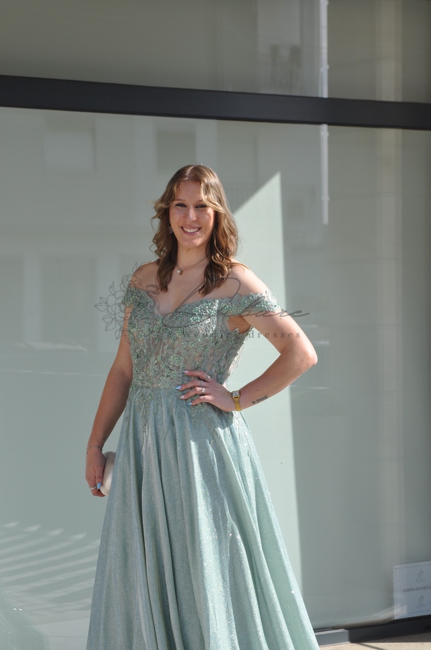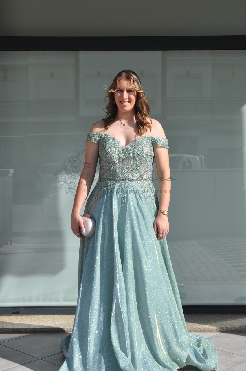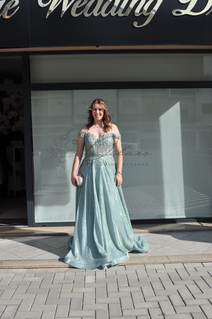 Este magnífico vestido de cerimonia comprido, num suave tom verde-água, é a definição de glamour e requinte para ocasiões inesquecíveis. O design destaca-se pelo seu corpete, adornado com intrincados bordados e aplicações de pedraria que captam a luz de forma deslumbrante, conferindo um toque de luxo artesanal à peça. A silhueta é realçada por uma cintura bem definida, de onde flui uma saia longa e vaporosa com um brilho subtil em todo o tecido. O corte fluido proporciona um movimento majestoso ao caminhar, tornando-o a escolha perfeita para madrinhas, damas de honra ou bailes de gala. É uma peça que equilibra perfeitamente a sensualidade do decote coração com a elegância de um vestido de corte clássico.