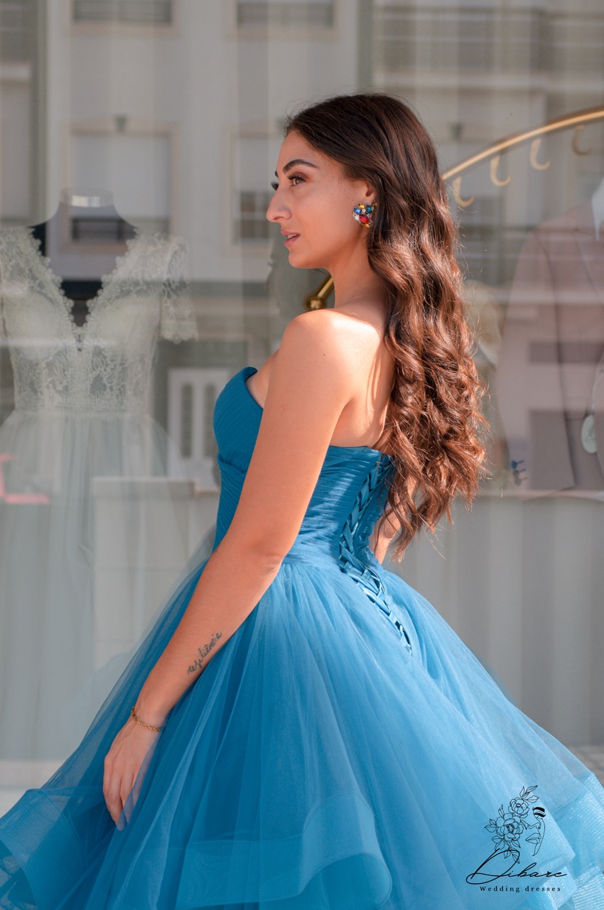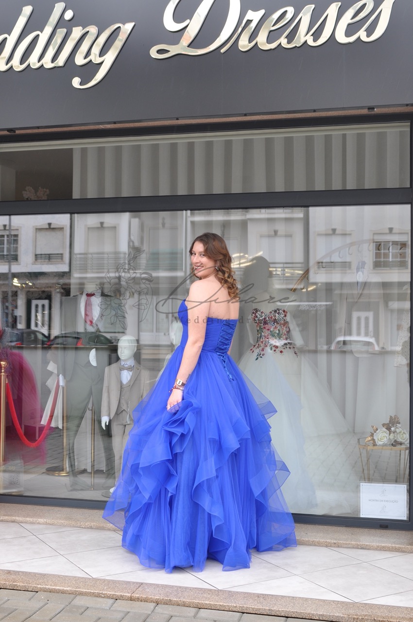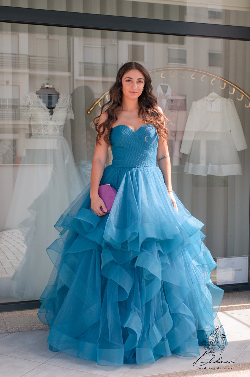 O vestido comprido sem alças, disponível nas cores petróleo ou rosa, é uma peça de impacto, com seu design extremamente volumoso em tule. O corpete sem alças destaca o colo e os ombros, proporcionando um ar sofisticado e feminino. O tule em camadas adiciona drama e movimento, criando um visual digno de eventos glamourosos. As cores intensas, petróleo ou rosa, trazem personalidade e elegância, fazendo deste vestido uma escolha perfeita para momentos que pedem grande estilo e presença.