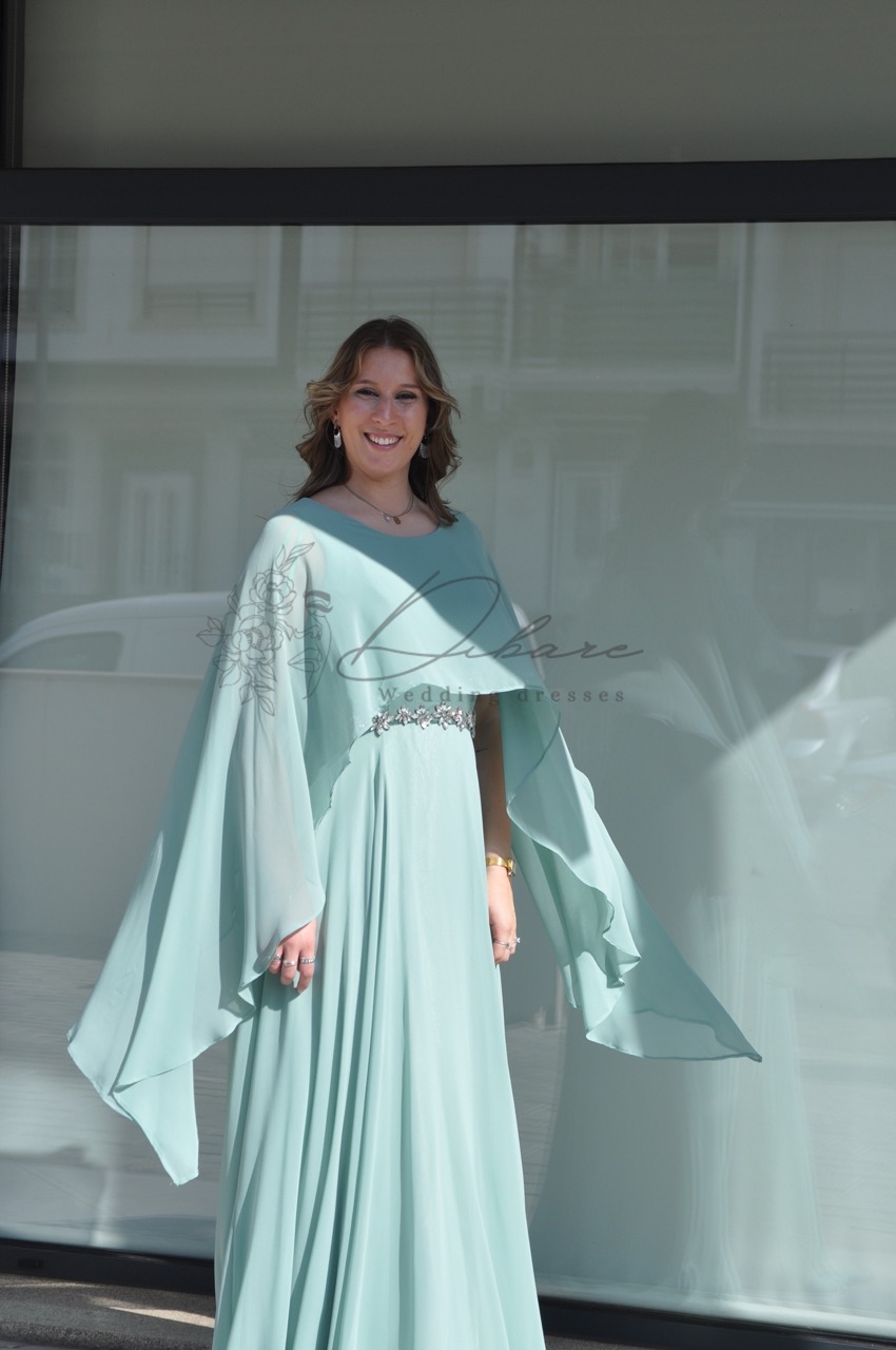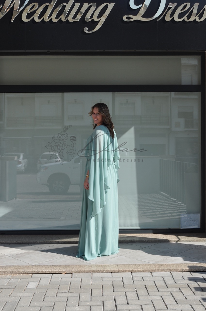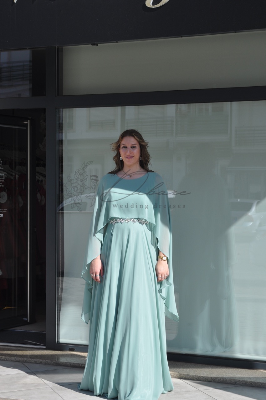 Este magnífico vestido de cerimonia num suave tom de verde água é a definição de elegância etérea e refinamento. Com uma silhueta longa e fluida, a peça destaca-se pelo seu design sofisticado que combina conforto e glamour de forma harmoniosa. O corpete é adornado com uma delicada capa de chiffon sobreposta, que flui suavemente sobre os ombros e braços, criando um movimento romântico e uma cobertura discreta. A cintura é acentuada por um detalhe de bordado cintilante, que adiciona um ponto de luz luxuoso e define a silhueta com graciosidade. A saia de corte evasé cai com leveza até ao chão, proporcionando um caminhar fluido e majestoso.