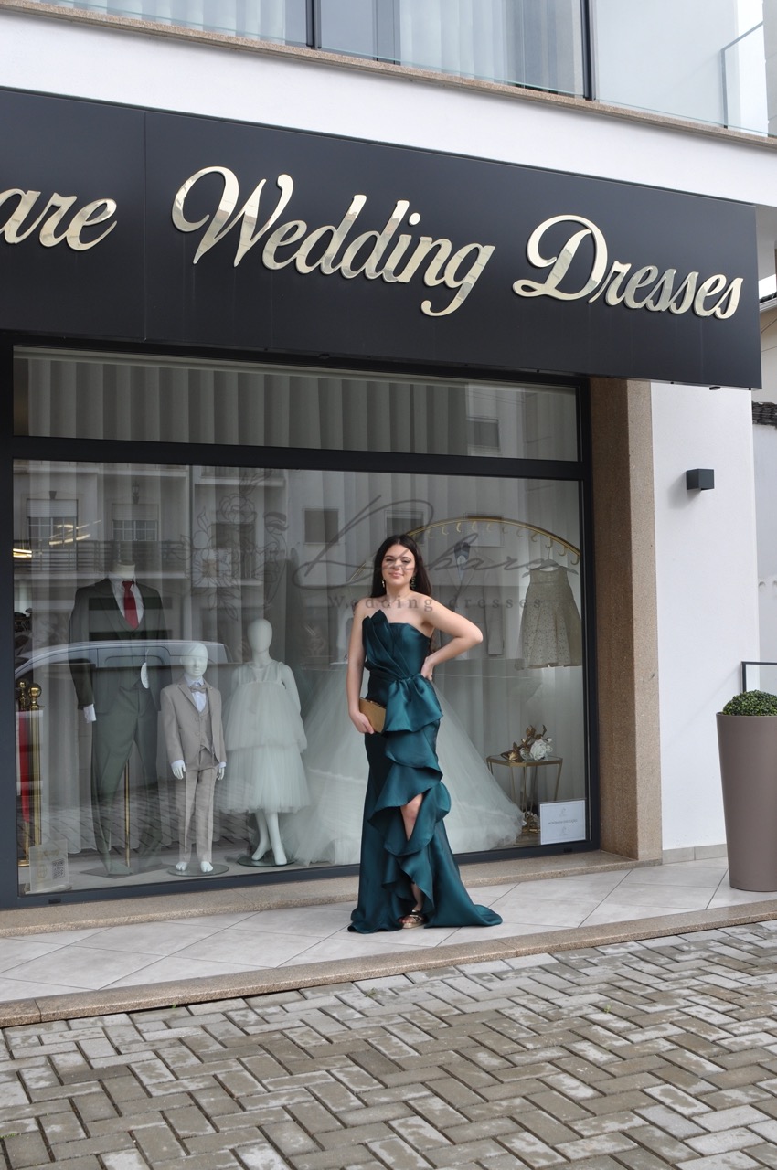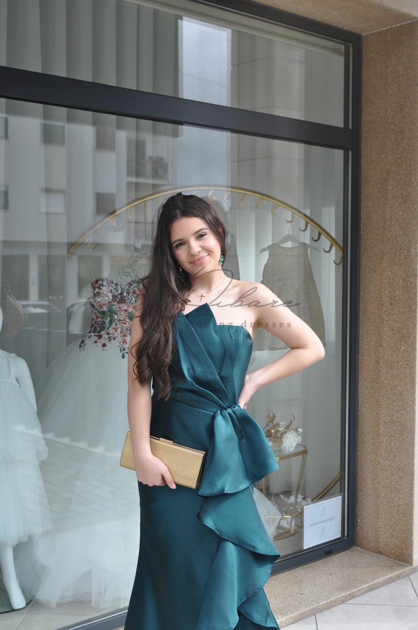 Este magnífico vestido de gala, num profundo e luxuoso tom de verde-garrafa (ou verde-esmeralda), é a personificação do glamour e do drama sofisticado. O design começa com um corpete cai-cai que realça o decote e os ombros, proporcionando uma base limpa e estruturada. O verdadeiro destaque desta peça reside na saia dramática, que apresenta uma sobreposição de tecido esvoaçante num efeito cascata, criando uma textura rica e um volume artístico. Estes folhos assimétricos conferem um movimento dinâmico e uma silhueta inesquecível a cada passo. A saia cai em comprimento total, mantendo a elegância de um vestido de alta costura.