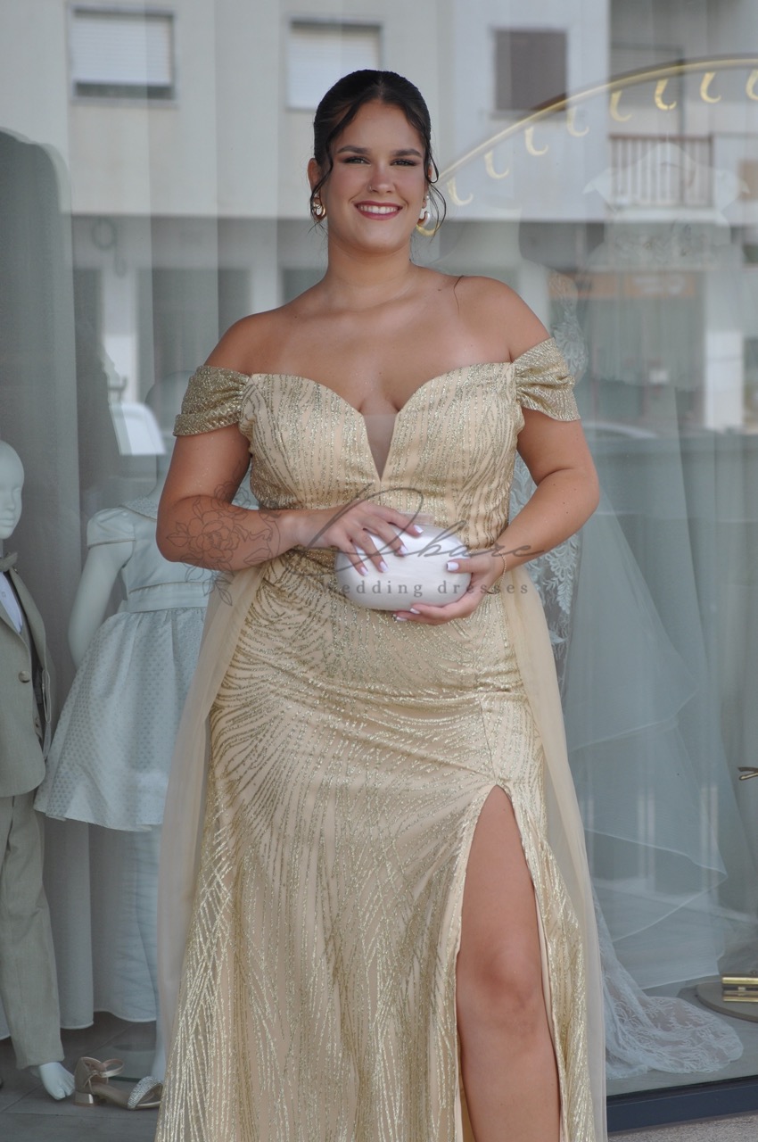 Este deslumbrante vestido de gala em tom champanhe é a escolha ideal para quem procura aliar sofisticação e sensualidade num visual memorável. Confeccionado em tule delicadamente trabalhado com brilhos subtis, a peça apresenta um corpete estruturado de decote em coração, realçado por elegantes alças descaídas que conferem um toque romântico e intemporal ao design. A saia fluida destaca-se pela sua imponência, apresentando uma abertura lateral profunda que permite liberdade de movimentos e acrescenta um elemento de modernidade audaz. O drapeado suave na zona da cintura esculpe a silhueta de forma harmoniosa, culminando numa peça que brilha sob qualquer iluminação.