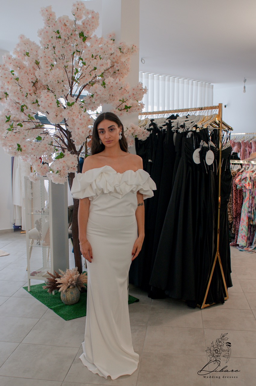 Vestido branco estilo sereia que exala elegância e sofisticação. Este vestido apresenta um decote à barco, que se estende suavemente nos ombros, proporcionando uma linha limpa e clássica que valoriza o colo e os ombros de maneira graciosa. O detalhe que realmente chama a atenção é o folho delicado que adorna o decote. Esse folho, com suas camadas suaves e elegantes, adiciona uma textura sutil e um toque de romance ao vestido.