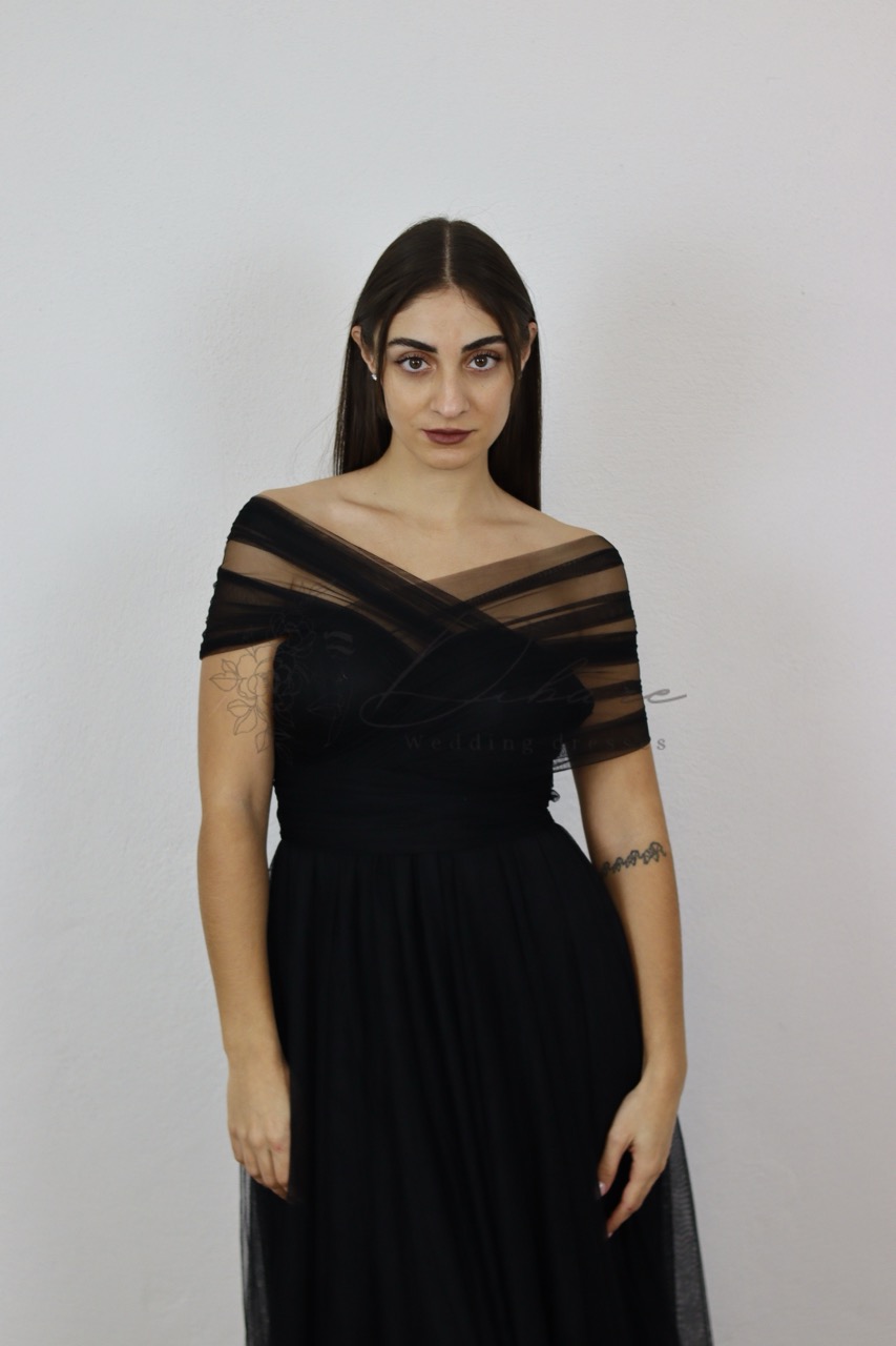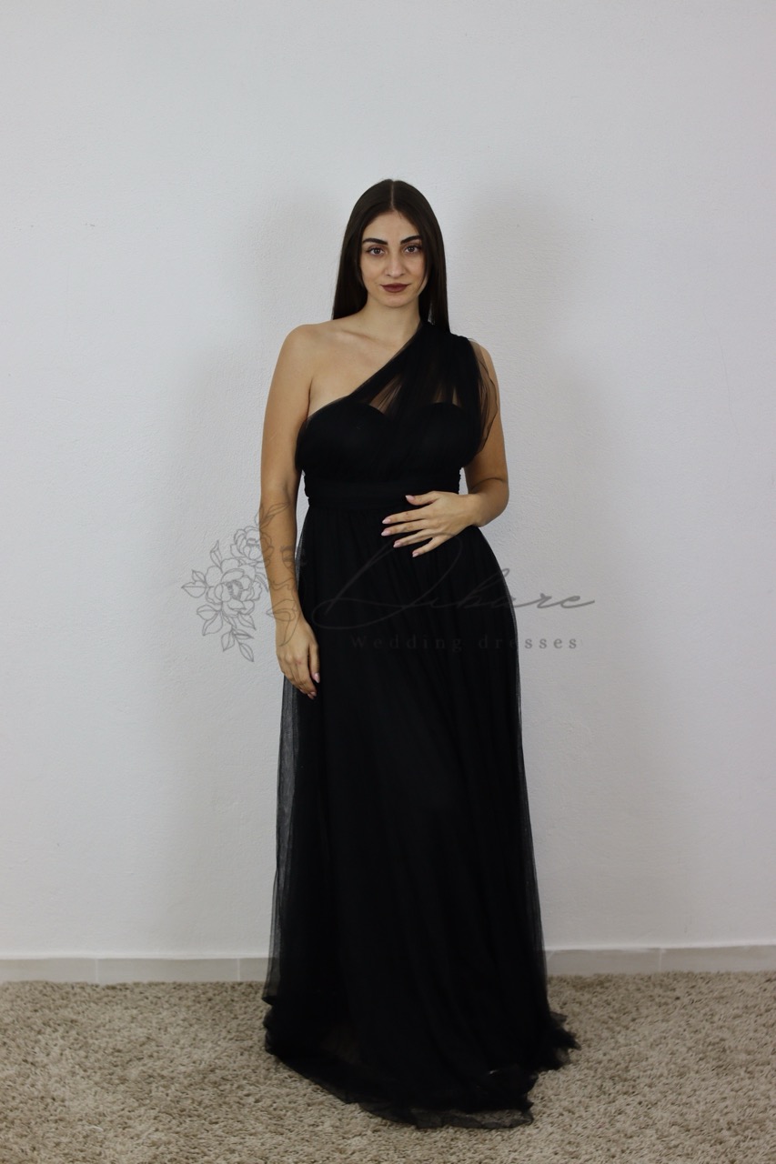 Um vestido longo em tule, disponível nas cores verde ou preto, destaca-se por suas alças multiposição, permitindo diversas formas de amarração e personalização do visual. O tecido de tule leve e fluido cria um efeito etéreo e sofisticado, enquanto o design versátil das alças oferece diferentes estilos, como cruzado nas costas ou amarrado no pescoço. A transparência sutil do tule confere movimento e charme, tornando-o ideal para eventos elegantes e contemporâneos