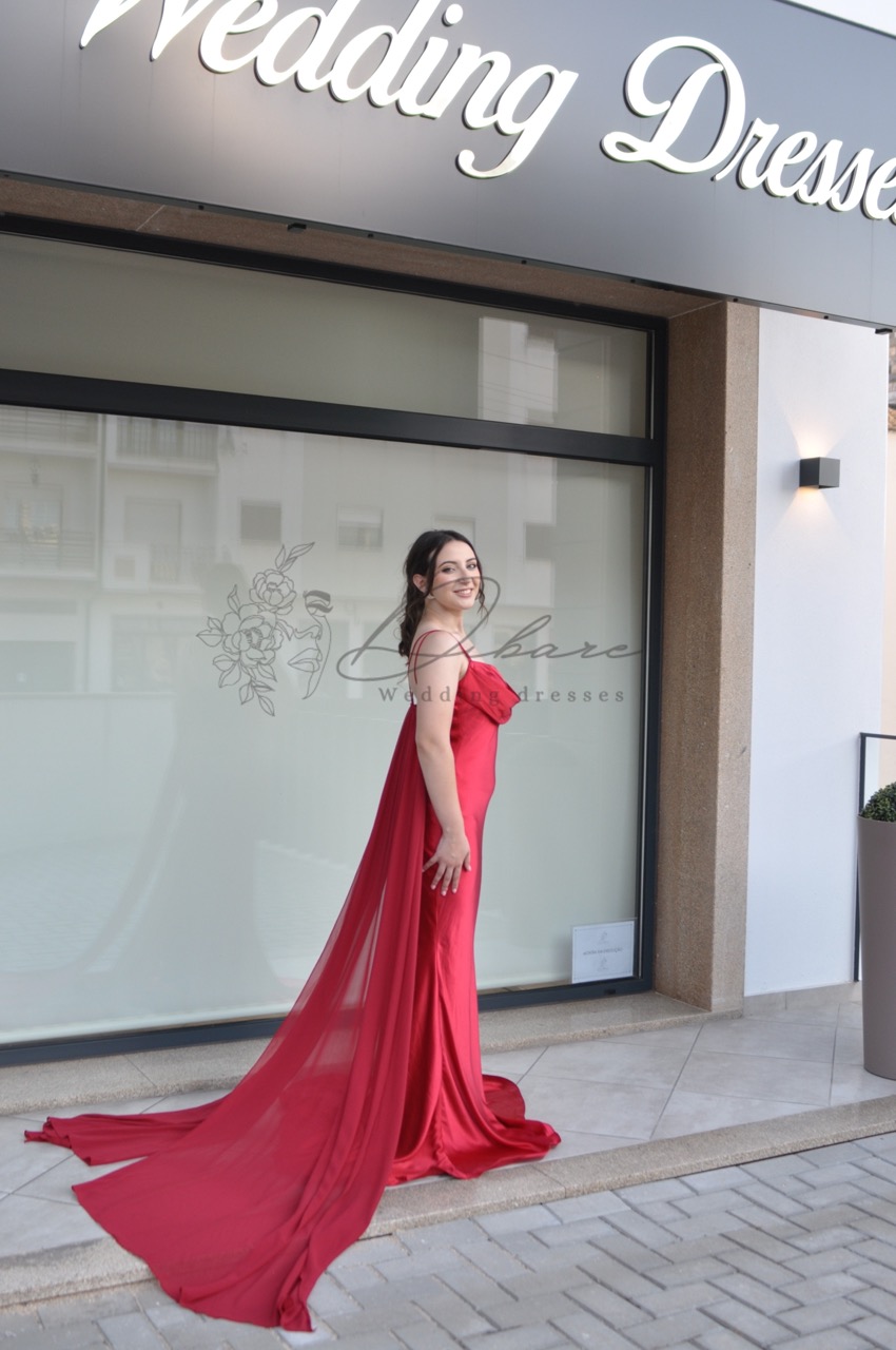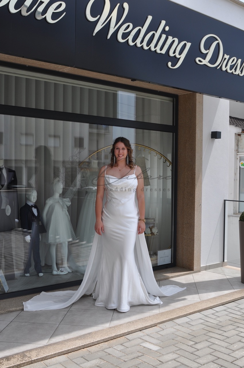 Este deslumbrante vestido de noiva exala uma elegância intemporal e um toque de modernidade sofisticada. O design apresenta uma silhueta sereia que abraça a figura, realçando as curvas de forma graciosa e sensual. O vestido com alças finas, é adornado com detalhes intrincados, que capturam a luz, garantindo um brilho subtil e luxuoso a cada movimento. O tecido, com um acabamento acetinado ou em cetim de seda, proporciona um caimento impecável e um toque macio, fluindo suavemente até ao chão. O que realmente distingue este modelo é a sua capa etérea e fluida. Fixada nos ombros ou nas costas do corpete, a capa substitui o véu tradicional, criando um efeito de realeza e drama. Os tecidos leves da capa esvoaçam elegantemente, conferindo um movimento mágico e uma aura de conto de fadas à noiva, culminando numa pequena e delicada cauda. Perfeito para a noiva que deseja combinar a sensualidade de uma silhueta sereia com a majestade de uma capa,