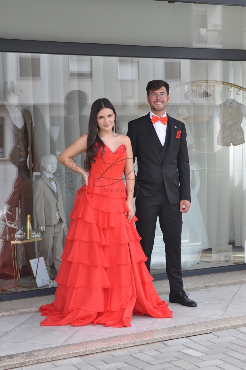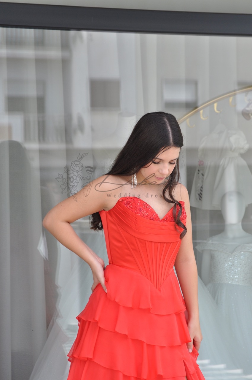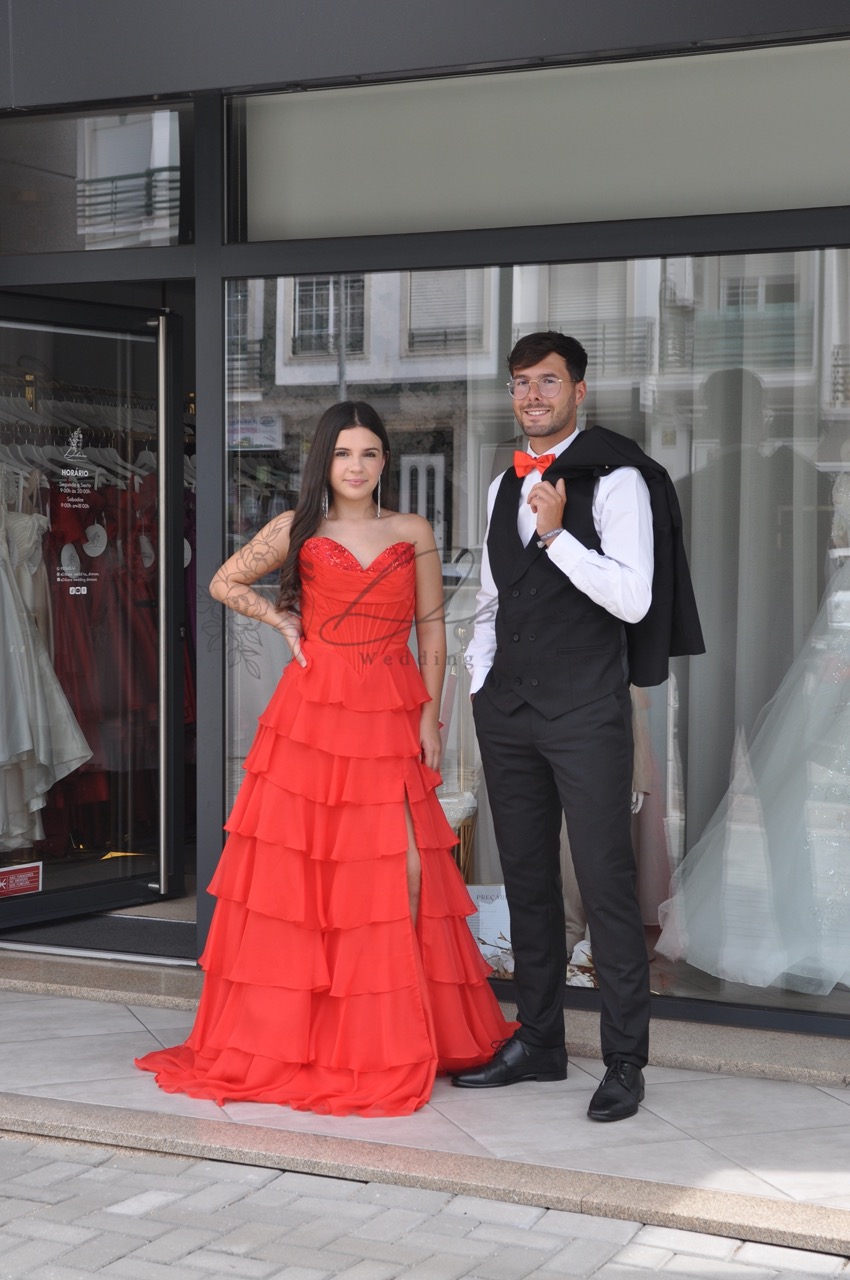 Este deslumbrante vestido de cerimonia/baile ou festa em vermelho vibrante é a escolha ideal para quem procura uma presença marcante e sofisticada em eventos de gala ou cerimónias especiais. Com um design que combina romantismo e ousadia, a peça destaca-se pela sua estrutura meticulosa e detalhes contemporâneos. O modelo apresenta um corpete estruturado de estilo cai-cai com um elegante decote em forma de coração, que valoriza a silhueta e oferece um suporte impecável. A saia é o elemento central deste design, composta por múltiplas camadas de folhos horizontais que conferem um volume fluido e um movimento gracioso a cada passo. Para um toque extra de sensualidade e modernidade, o vestido inclui uma racha lateral profunda, permitindo uma maior liberdade de movimentos e evidenciando o calçado. A cauda discreta prolonga a silhueta, garantindo um visual dramático e luxuoso, digno de uma passadeira vermelha.