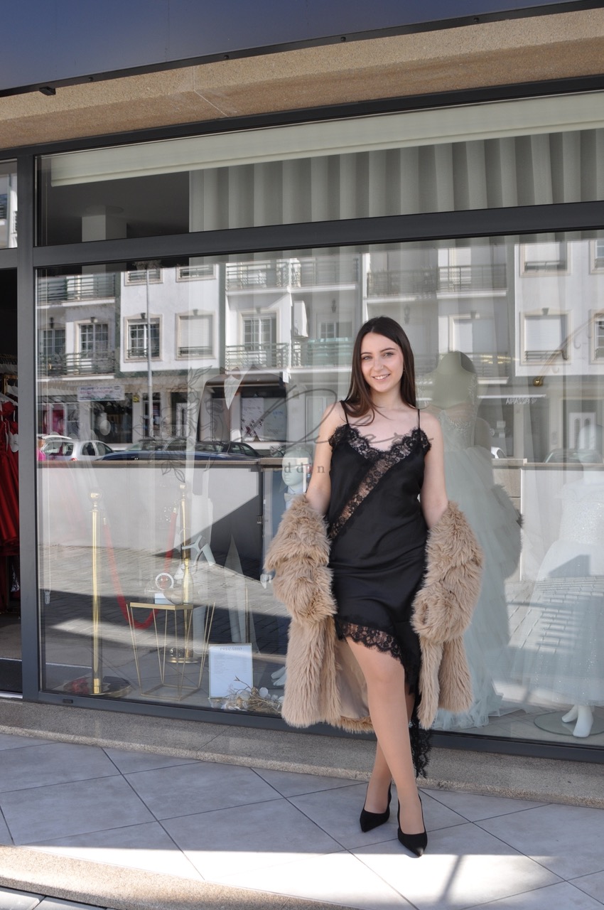 Este elegante vestido midi é a peça ideal para quem procura um visual que combina sofisticação clássica com um toque de ousadia moderna. Confeccionado num tecido acetinado de brilho subtil e toque sedoso, o modelo destaca-se pela sua fluidez e pelo corte que acompanha delicadamente as linhas do corpo. O grande diferencial desta peça reside nos seus detalhes em renda floral preta, aplicados de forma estratégica no decote em “V” e numa elegante faixa diagonal que atravessa o tronco, conferindo uma transparência luxuosa e feminina. A bainha assimétrica é igualmente rematada com uma generosa barra de renda, criando um movimento fluido e sofisticado ao caminhar. Com alças finas que realçam a zona dos ombros, este vestido é extremamente versátil