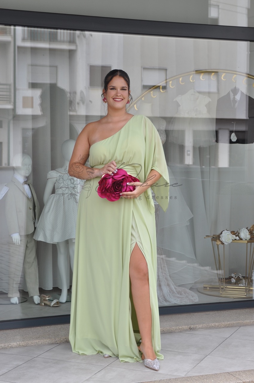 Este deslumbrante vestido longo em tom verde-lima pastel é a escolha perfeita para quem procura uma elegância etérea e contemporânea em eventos de prestígio. Confecionado num tecido fluído de alta qualidade, o modelo destaca-se pelo seu design assimétrico de um só ombro, que confere um ar de sofisticação grega moderna à silhueta. O drapeado delicado no corpete flui naturalmente para uma saia longa e vaporosa, que apresenta uma racha lateral ousada, permitindo movimento e um toque de sensualidade refinada. A cintura é subtilmente realçada, criando uma transição harmoniosa entre o corte estruturado do ombro e a leveza da saia.