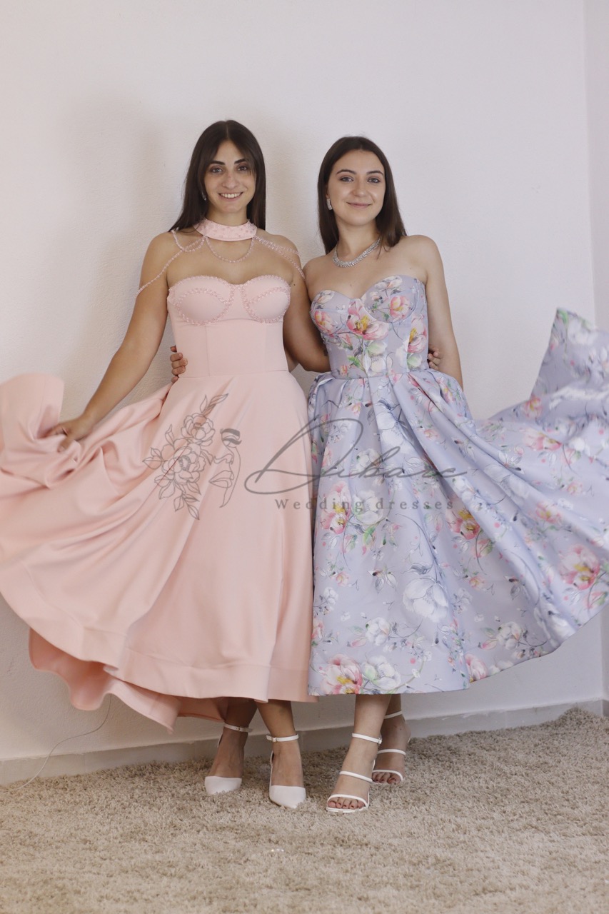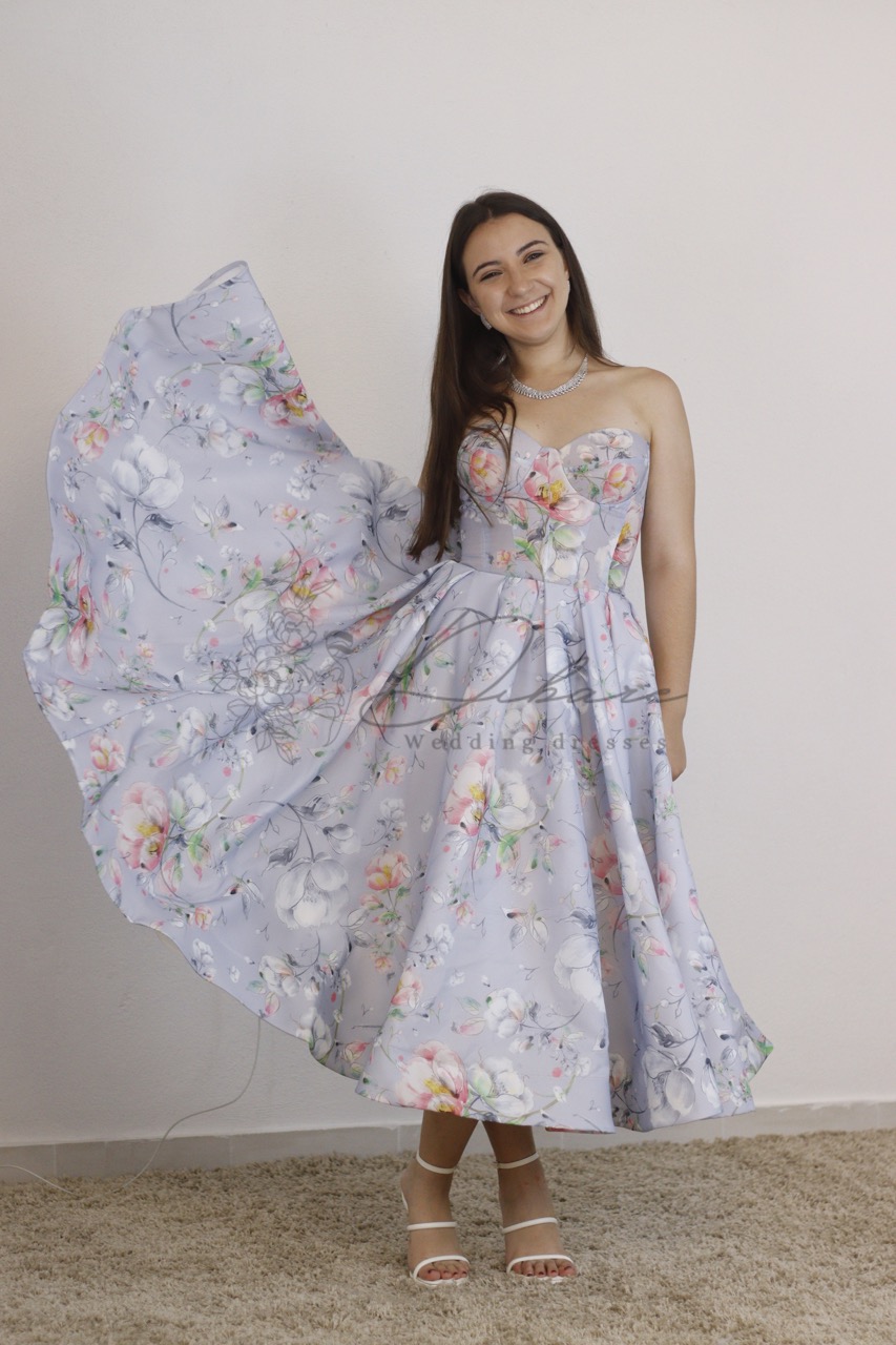 Este encantador vestido de festa com padrão floral sobre um fundo azul lavanda é a escolha perfeita para quem procura um visual romântico e radiante. Com uma estética clássica de inspiração vintage, esta peça destaca-se pela sua leveza e pelo movimento gracioso que imprime a cada passo. O design apresenta um elegante corpete estilo cai-cai com decote em coração, estruturado para realçar suavemente o busto e definir a cintura de forma impecável. A saia, com um corte em evasê muito generoso, abre-se num volume fluído que termina num comprimento midi, conferindo um ar sofisticado e juvenil ao mesmo tempo. O padrão floral delicado, em tons suaves, adiciona uma camada de frescura e feminilidade que torna este vestido ideal para celebrações ao ar livre. Confeccionado num tecido com um cair leve e um toque acetinado, este modelo é perfeito para convidadas de casamentos, batizados ou festas de jardim.