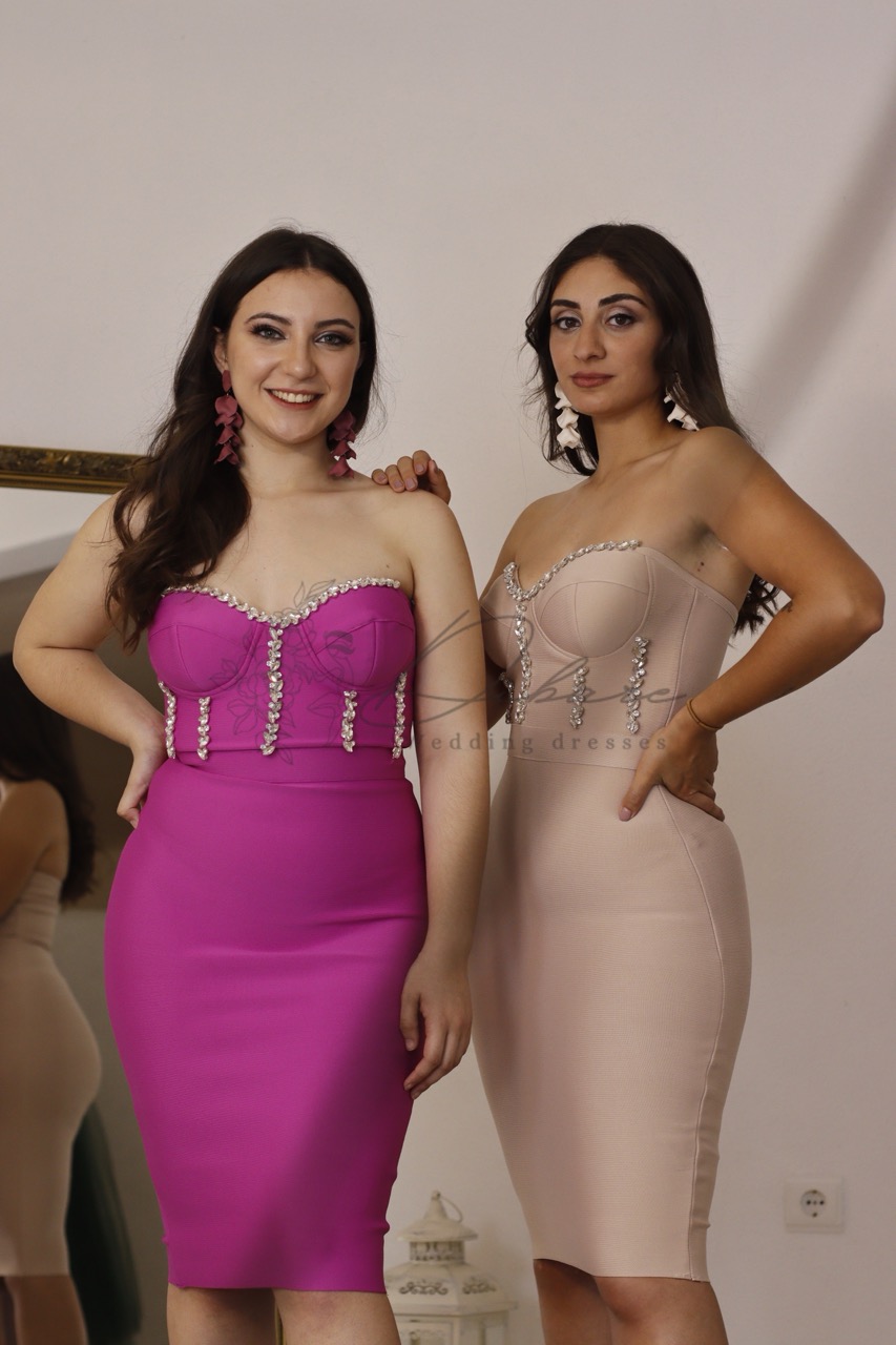 Elegância e glamour definem este deslumbrante vestido bandage em formato tubo, a escolha perfeita para quem procura uma silhueta esculpida e um toque de brilho. Disponível em duas cores cativantes – Rosa Vibrante (Fúcsia) e Bege Sofisticado – este modelo garante um visual inesquecível em qualquer evento. O design é marcado por um corte strapless (sem alças) e um corpete estruturado que oferece excelente suporte e destaca o decote. A área do corpete é ricamente adornada com aplicações de pedraria cintilante, dispostas em padrões verticais e no contorno, adicionando um brilho luxuoso e festivo. O tecido bandage de alta qualidade assegura um ajuste perfeito e modelador, abraçando a figura e criando uma silhueta clean e elegante até ao comprimento midi.