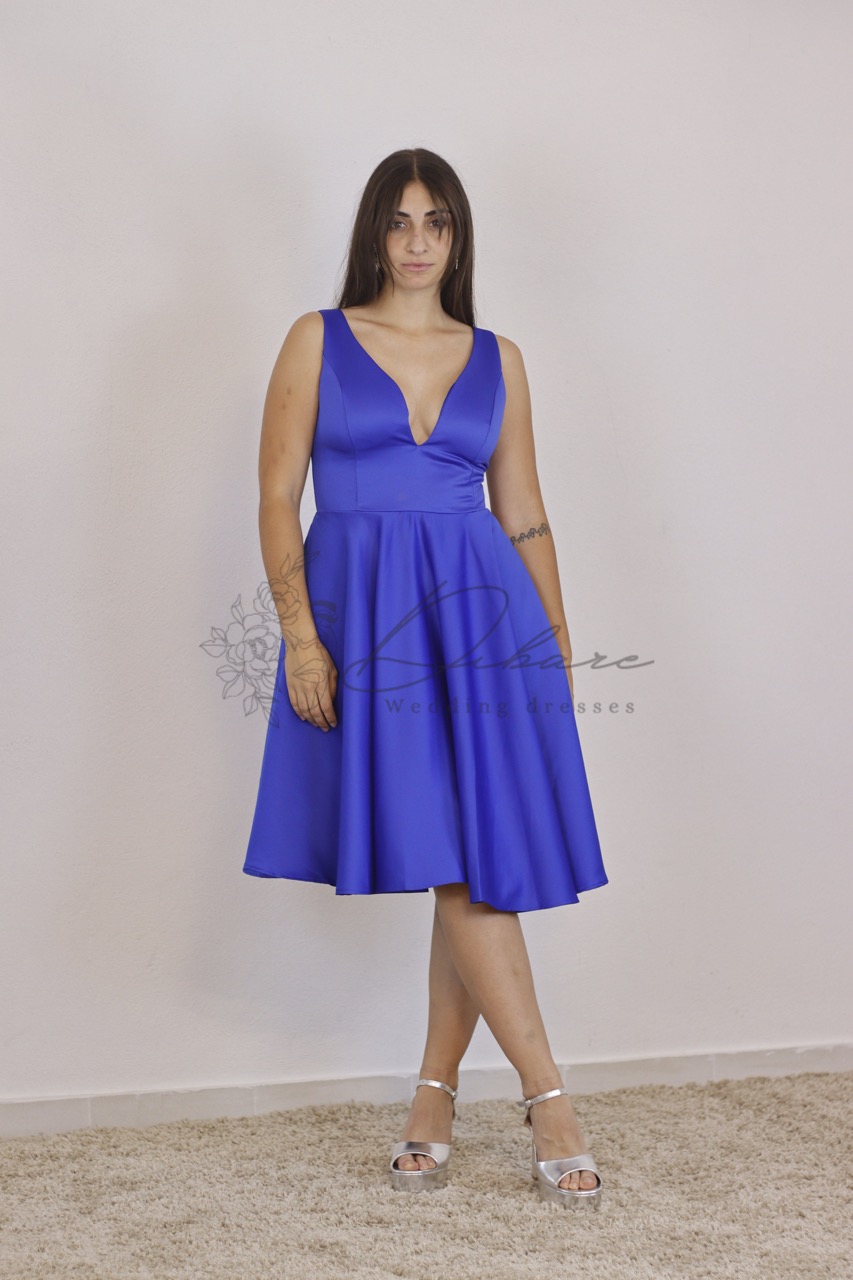 Este é um vestido de festa encantador e sofisticado, ideal para quem procura um visual vibrante e elegante. Apresentado num tom azul royal intenso, este modelo destaca-se pelo seu brilho subtil e acabamento acetinado, conferindo uma aura de luxo a qualquer evento especial. O design apresenta um decote em V profundo e estruturado, que valoriza o colo de forma feminina, equilibrado por alças largas que garantem conforto e suporte. A cintura é bem marcada, dando lugar a uma saia evasê de comprimento médio (acima do joelho) com pregas delicadas. Este corte em “A” proporciona um movimento fluido e gracioso ao caminhar, tornando-o a escolha perfeita para casamentos ou galas.