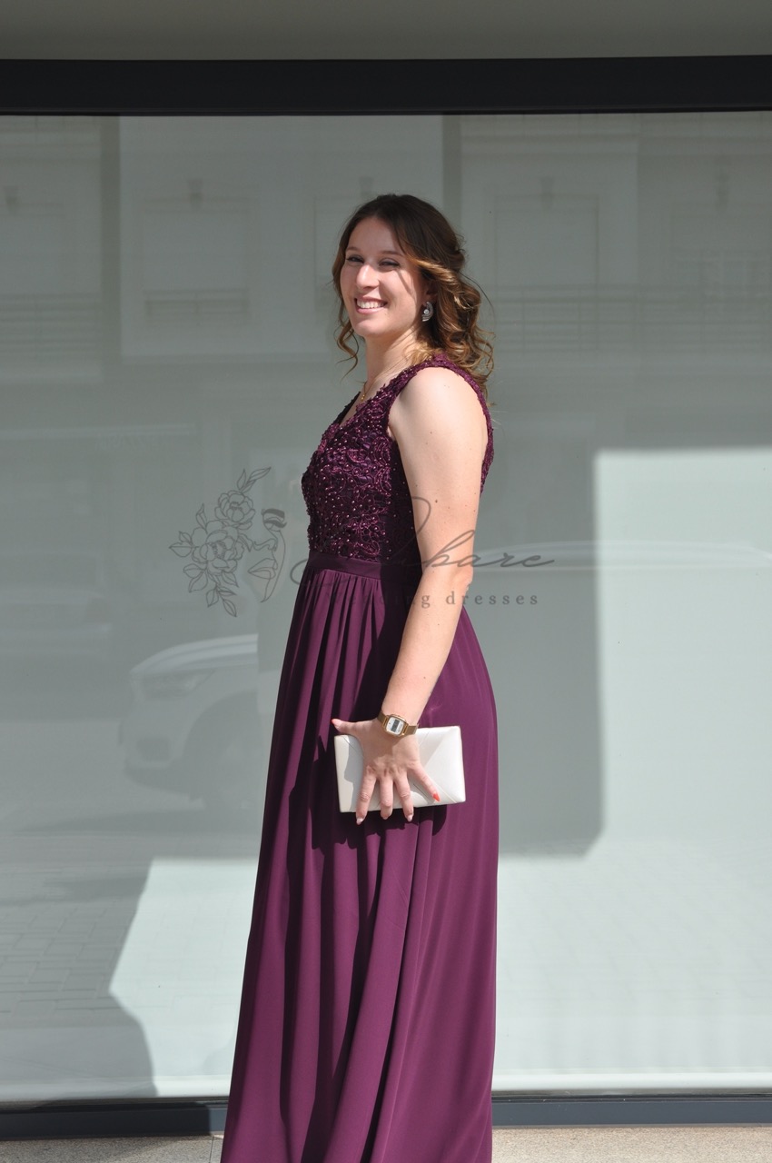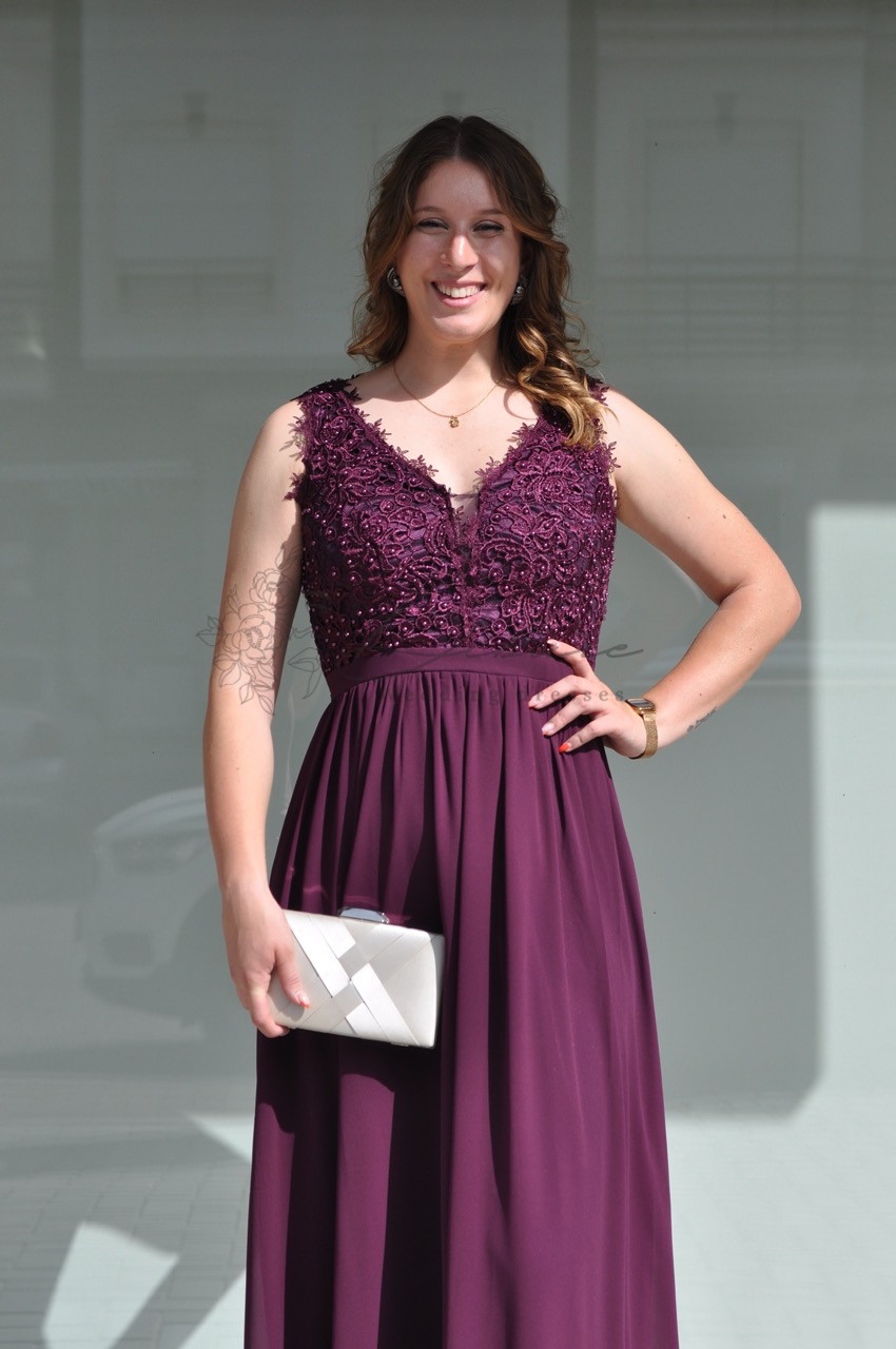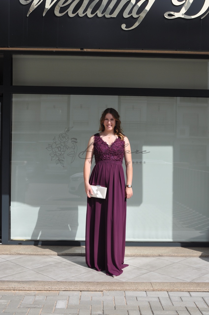 Deslumbre em qualquer evento formal com este magnífico vestido longo, um modelo que combina elegância intemporal com um toque de sofisticação moderna. Confeccionado numa cor roxo-ameixa rica e profunda, este vestido é a escolha perfeita para madrinhas, convidadas de casamento, bailes de finalistas ou qualquer gala especial. O corpete apresenta um delicado decote em V e é adornado com uma renda trabalhada de padrão floral, que confere uma textura luxuosa e um charme romântico. O design de cintura império ou subida alonga a silhueta, e a saia flui suavemente em tecido liso, criando um caimento elegante e fluido que se move graciosamente a cada passo. O comprimento maxi garante uma presença marcante e formal.