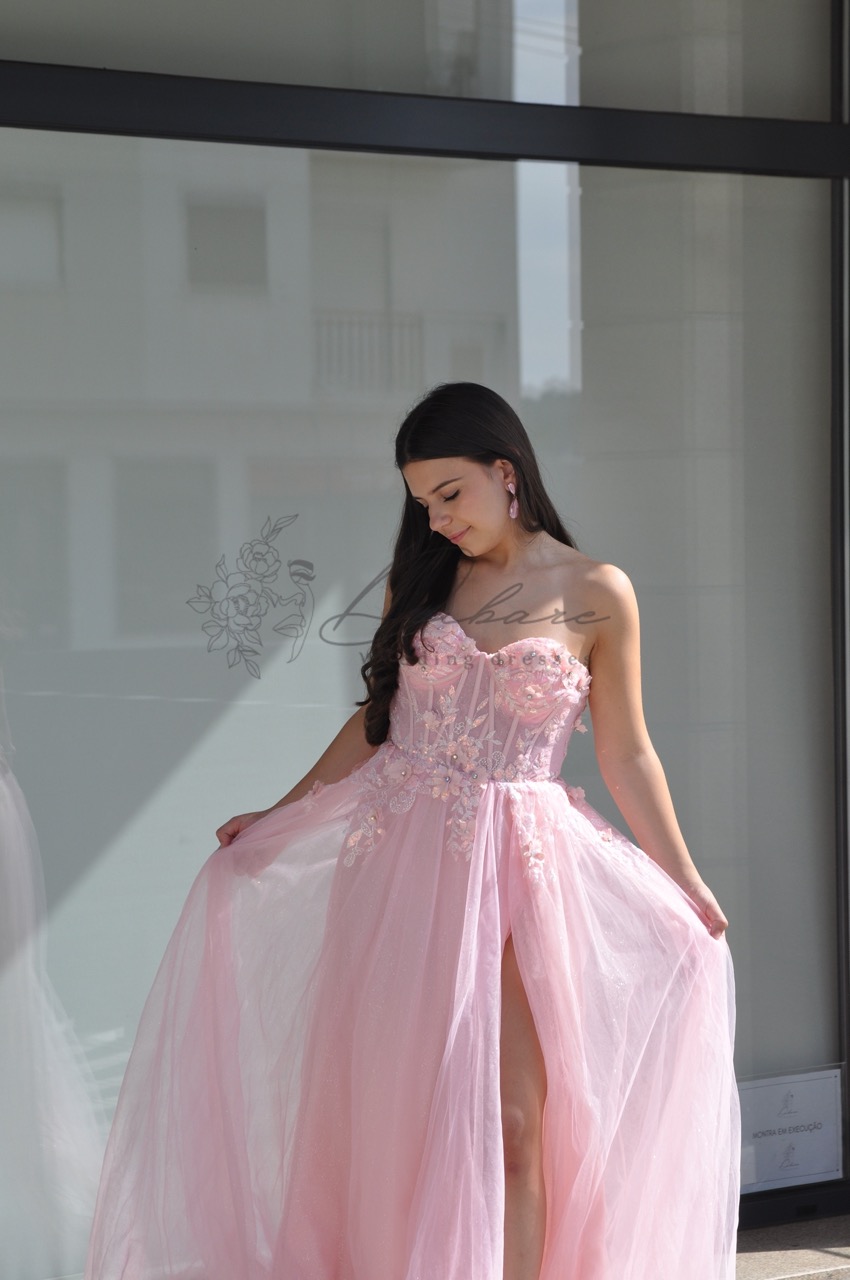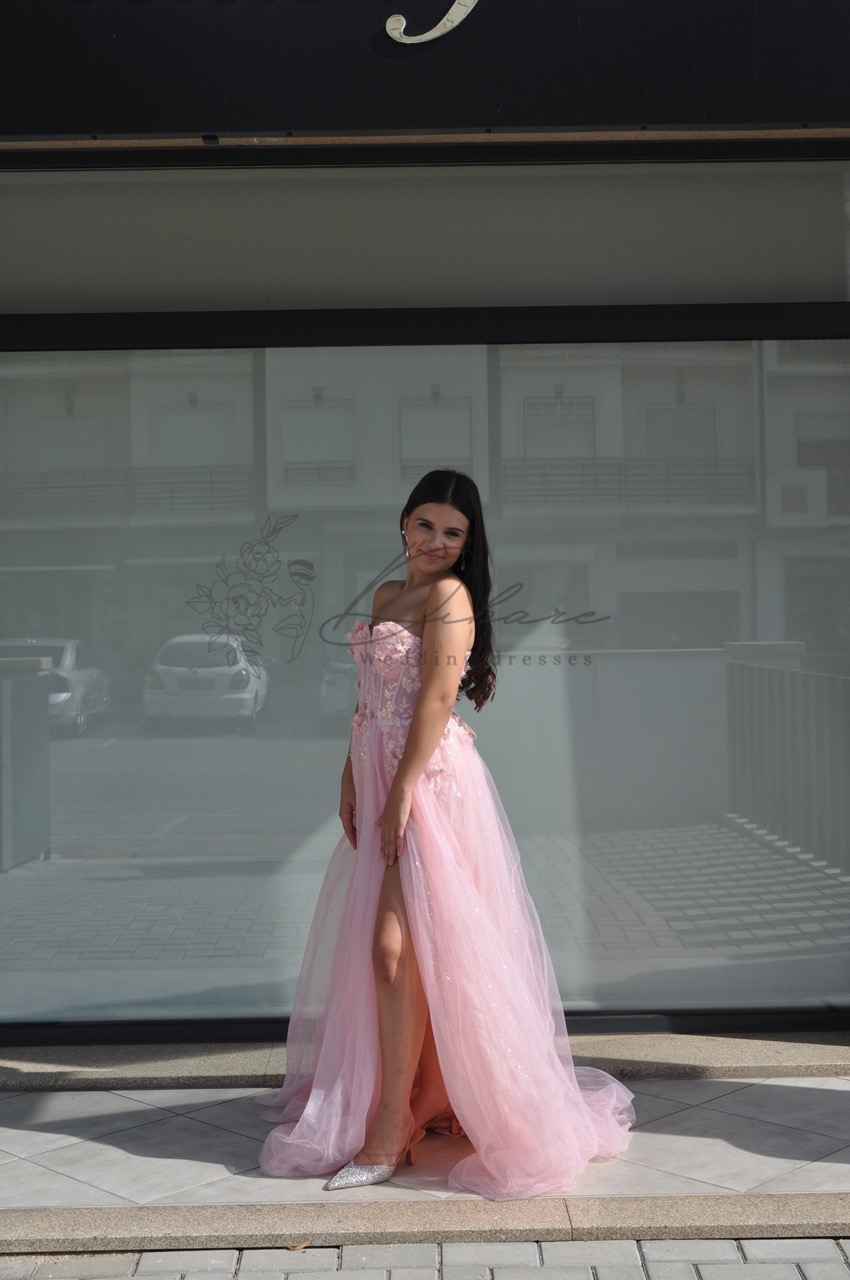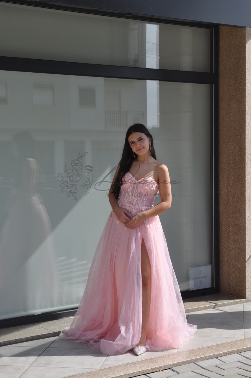 Este encantador vestido de baile em tom rosa claro é a personificação do romantismo e da delicadeza, sendo a escolha perfeita para finalistas, madrinhas ou convidadas de eventos formais. A peça destaca-se pelo seu corpete estruturado estilo corset, adornado com aplicações florais em relevo e detalhes brilhantes que captam a luz de forma sublime. O decote em forma de coração, realça a feminilidade com um toque de doçura. A saia longa e volumosa é composta por várias camadas de tule leve, criando um movimento etéreo e digno de um conto de fadas. Para um toque de modernidade e elegância, o design inclui uma racha lateral profunda que revela subtilmente a perna, equilibrando perfeitamente a estética clássica com um detalhe audaz.