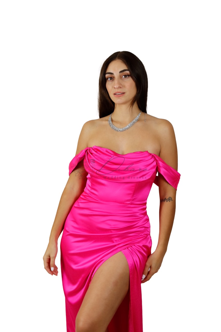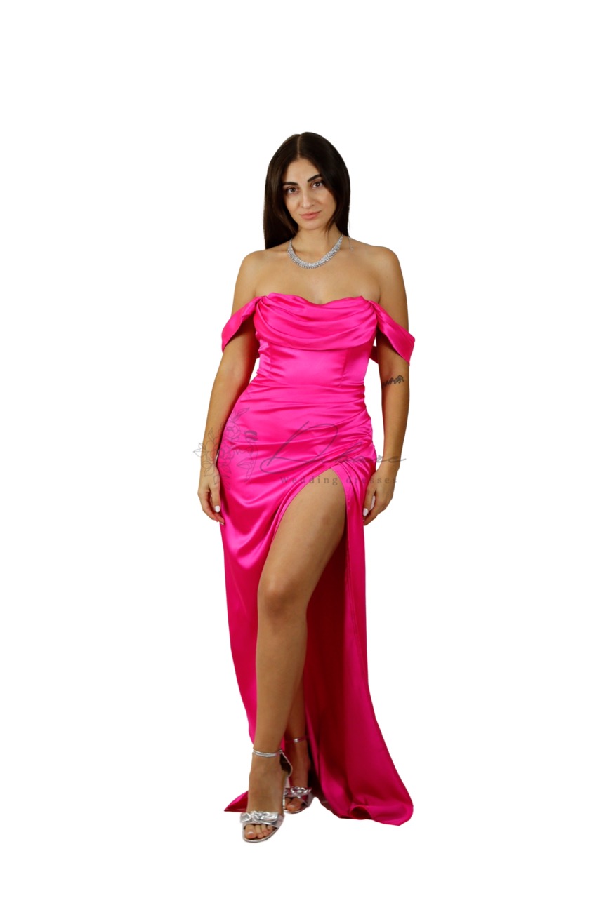 Este vibrante vestido de gala em rosa é a escolha definitiva para quem deseja marcar presença com ousadia e glamour. Confeccionado num tecido acetinado de brilho luxuoso, a peça destaca-se pelo seu design de ombros descobertos e um decote drapeado que confere uma aura de sofisticação moderna. A estrutura do corpete é pensada para esculpir a silhueta, apresentando um efeito franzido lateral que culmina numa deslumbrante racha profunda, revelando a perna de forma elegante e sedutora. O corte fluido da saia longa garante um movimento dramático e impactante a cada passo.