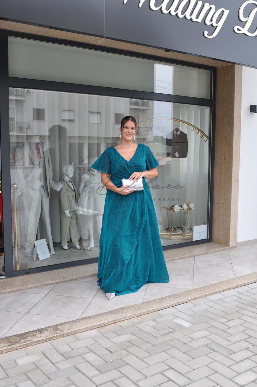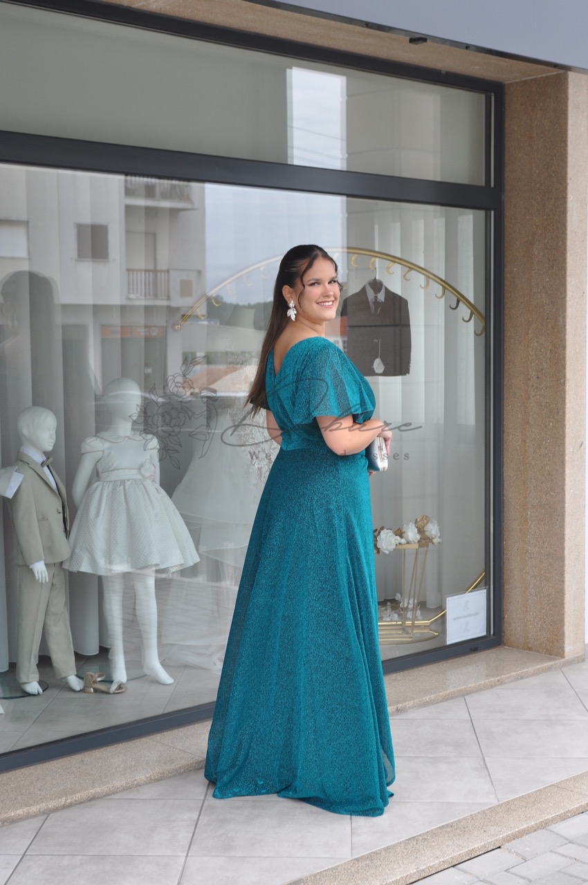 Este magnífico vestido de gala longo num tom azul-petróleo profundo é a escolha definitiva para quem deseja aliar majestade e conforto numa peça só. Confecionado em tule delicado com um brilho subtil, este modelo destaca-se pela sua fluidez etérea, proporcionando um movimento encantador e uma presença inesquecível em qualquer evento formal. O design apresenta um elegante decote em “V” cruzado que valoriza o colo de forma refinada, prolongando-se para mangas curtas em estilo borboleta, amplas e leves, que oferecem uma cobertura graciosa aos ombros. A cintura é suavemente marcada para definir a silhueta, dando lugar a uma saia volumosa de corte em “A” que cai de forma impecável até ao chão.