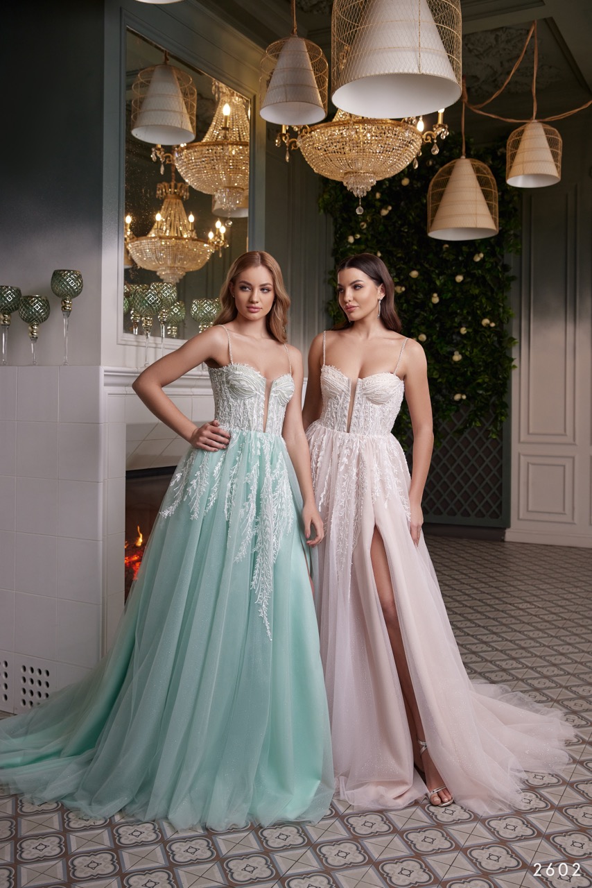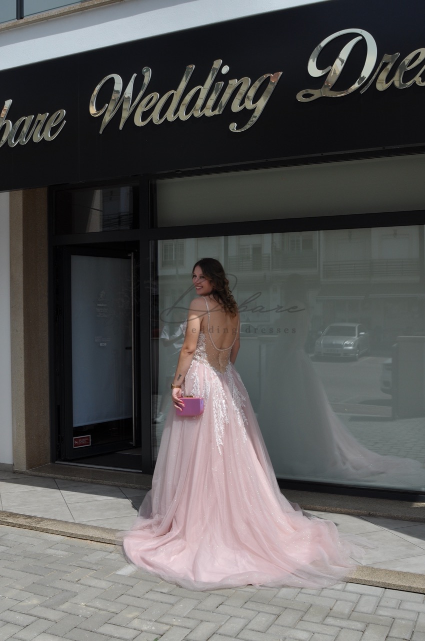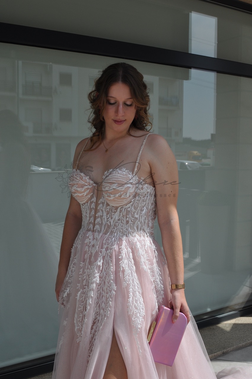 Este deslumbrante vestido gala exala romance e sofisticação, sendo a escolha perfeita para quem procura um visual etéreo e inesquecível. A peça apresenta um corpete justo e estruturado com um decote coração e alças finas, ricamente decorado com aplicações rendadas e brilhantes que se espalham de forma delicada, conferindo um toque de glamour cintilante. A silhueta é definida pela cintura marcada, de onde cai uma saia volumosa e fluida, confeccionada em tule num suave tom de rosa claro/blush. Um detalhe ousado e moderno é a racha alta na perna, que adiciona movimento e um toque sensual, permitindo um caminhar elegante. Combinando o brilho subtil das aplicações com a leveza do tule, este vestido é a personificação da elegância moderna.