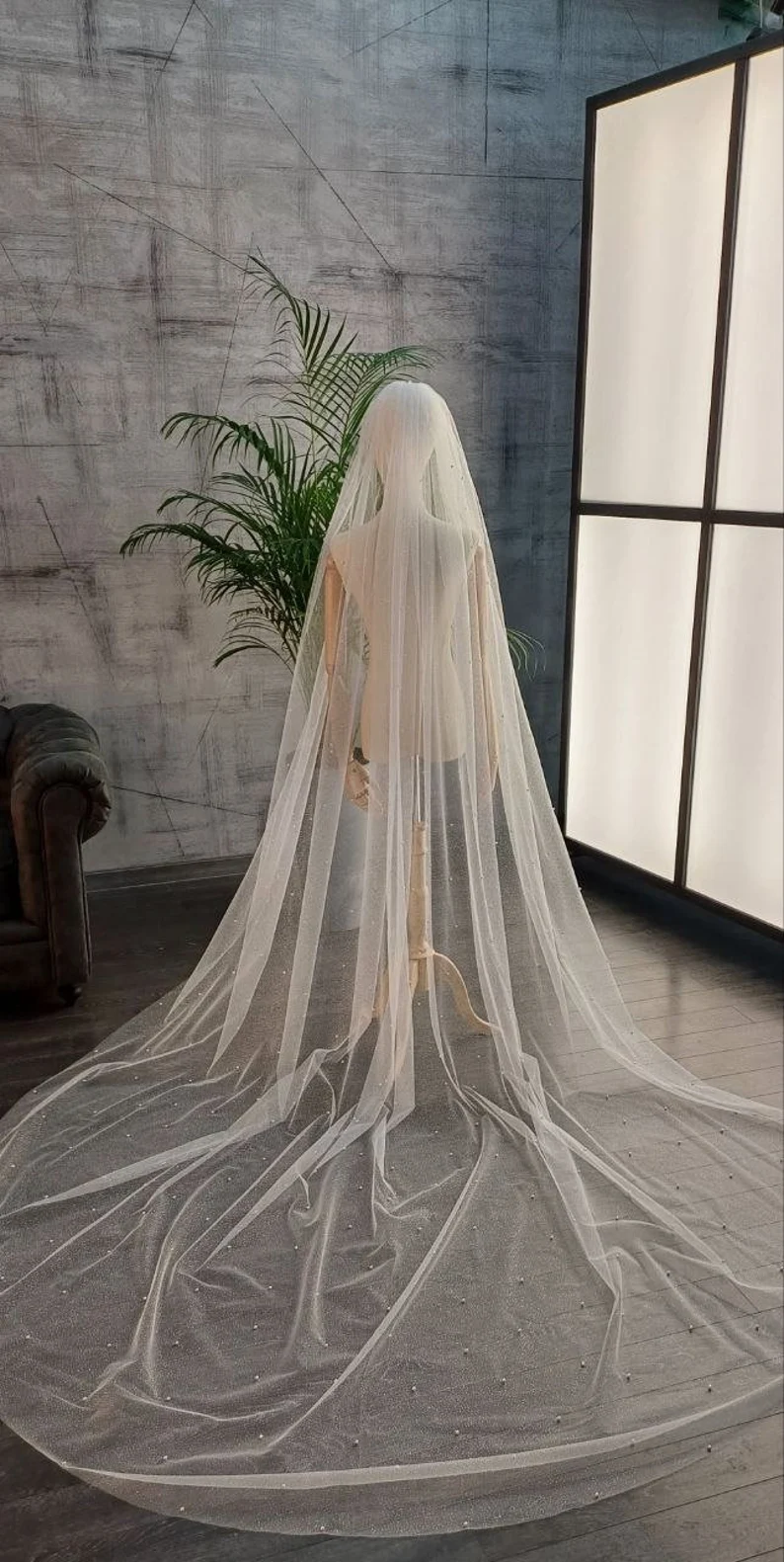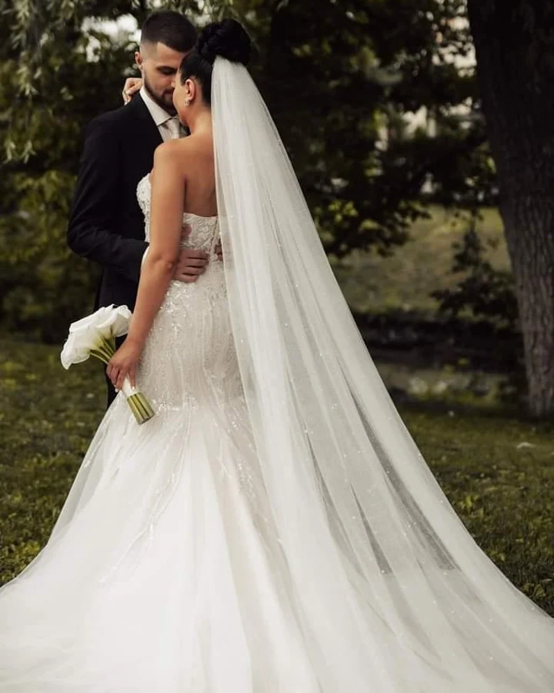 O véu “Stardust” com pérolas é a peça definitiva para a noiva que deseja uma entrada triunfal e cinematográfica. Este modelo de comprimento catedral estende-se graciosamente pelo chão, criando uma moldura luxuosa para o vestido. O tule de seda premium é densamente adornado com micro-pérolas aplicadas de forma orgânica e uma fina camada de glitter que capta e reflete a luz a cada movimento. A sua transparência cristalina permite que os detalhes do vestido permaneçam visíveis, enquanto adiciona uma camada de textura e brilho que parece emanar da própria noiva.